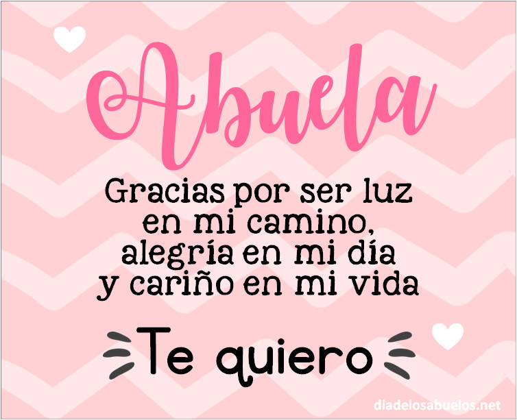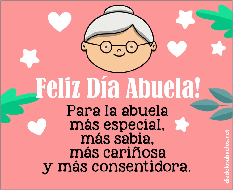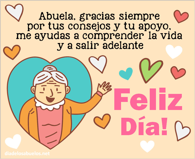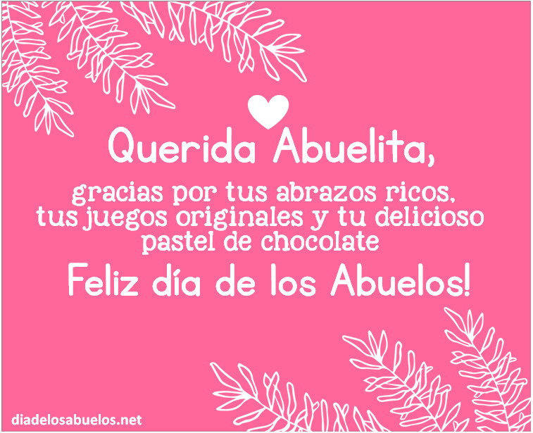 Con estas bonitas frases lograrás sacarle una sonrisa a tu abuela querida. Descargar y enviar de forma rápida por WhatsApp Feliz día de la Abuela. Tu saludo llegará al instante. Una gran idea para desear un Feliz día a tu abuelita un lindo detalle desde el corazón. La abuela es una figura fundamental en la familia es como una segunda mama, representa un gran apoyo a la familia y nos dan lo más importante de la vida que es amor, tiempo y dedicación por eso es importante también nosotros como hijos y nietos retribuirle ese amor incondicional a través de frases o tarjetas y sobre de todo lo más importante un fuerte abrazo y beso