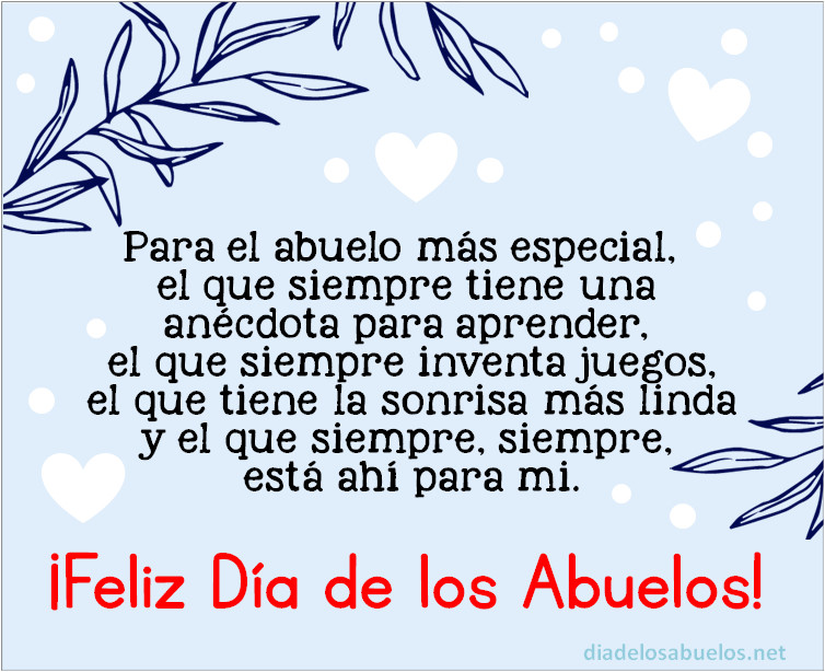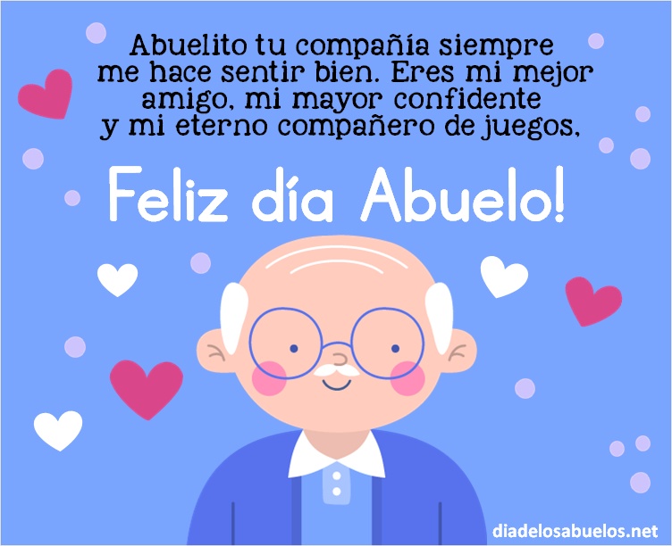 1 mensajes que salen de dentro del corazón Abuelito tu compañía siempre me hace sentir bien. Eres mi mejor amigo, mi mayor confidente y mi eterno compañero de juegos, Feliz día Abuelo!