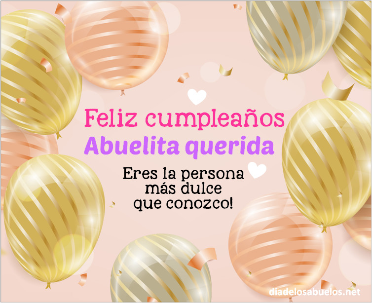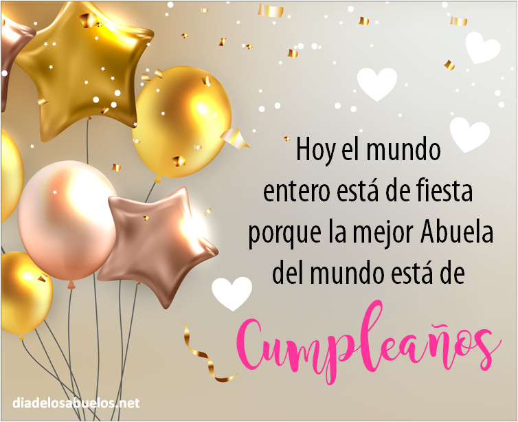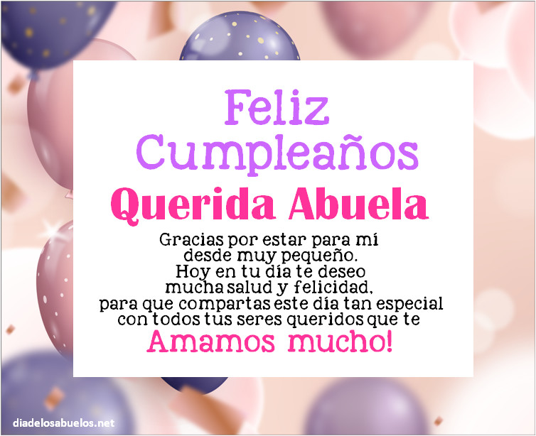 Abuela necesita sentir en su piel lo mucho que lo quieres. Elige una dedicatoria que te inspire que homenaje a tu abuelita querida. Recuerda que no existe un regalo perfecto, pero si los regalos personalizados o emotivos tienen un plus. Mensajes de feliz cumple para enviar a tu abu. Tarjetas para desear feliz cumpleaños con diferentes motivos y diseños de globos, banderines, torta, tarta, pastel, Confeti, rosas, flores, corazones, regalos y más. Es una oportunidad para atesorar una conexión abuela / nietos y pasar un tiempo familiar de calidad juntos.