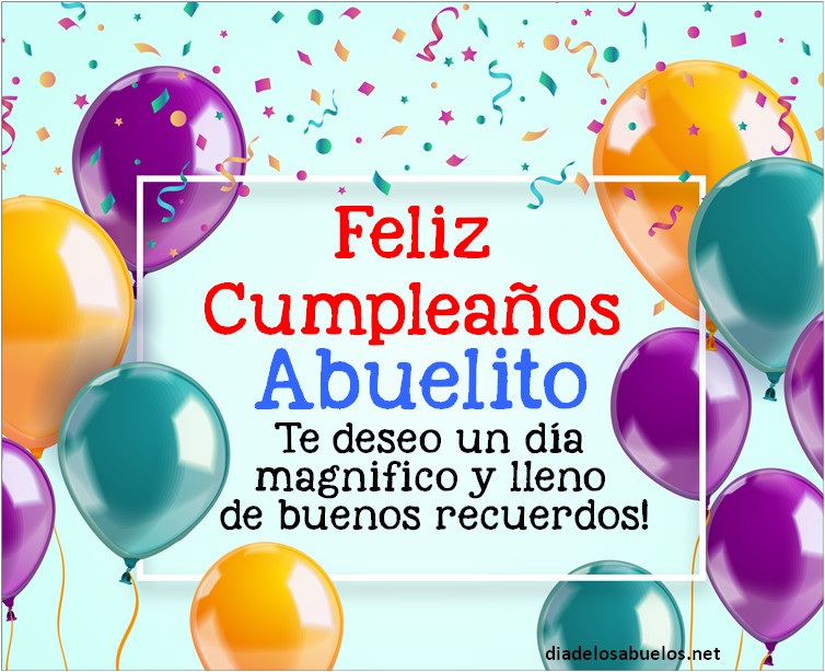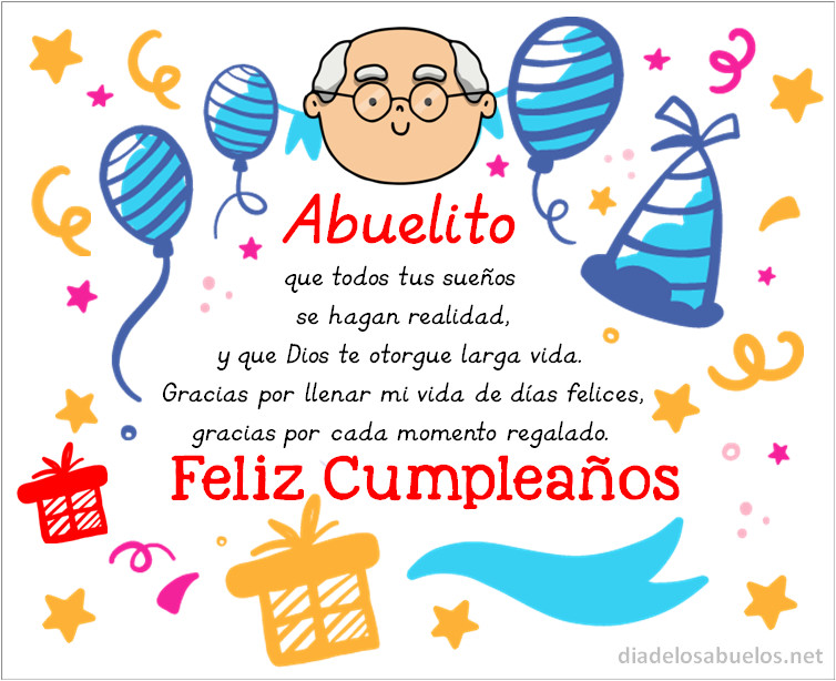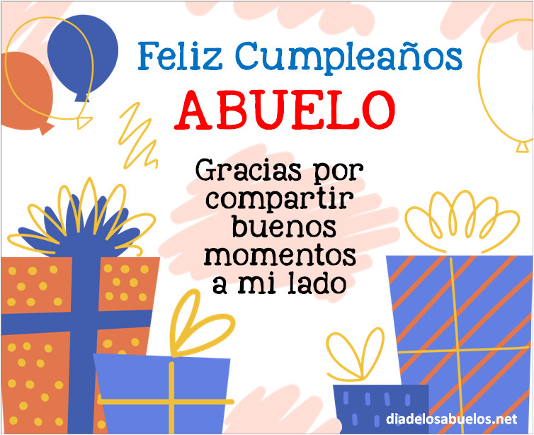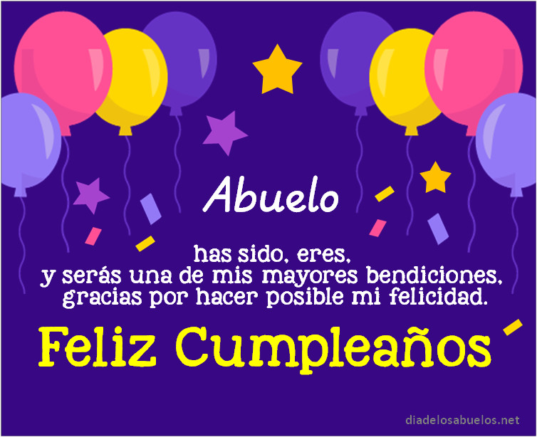 ¿Tu abuelo cumple años? Expresar lo que sentimos no es tarea fácil, encontrar las palabras perfectas es más fácil pensarlo que decirlo. No te preocupes estamos para ayudarte en el proceso, Sorprende a tu abuelo en su día con nuestra bonita colección de imágenes de Cumpleaños para el abuelito con frases. Selecciona la tarjeta que más te guste y envíala al instante. Recuerda que los abuelos son nuestros pilares de fuerza. Y les encanta que los mimen. Hoy es el día de los abuelos. Se observa el día para celebrar el vínculo entre abuelos y nietos. No solo te aman más que a tus padres, sino que también te enseñan algunas de las lecciones más importantes sobre la vida.